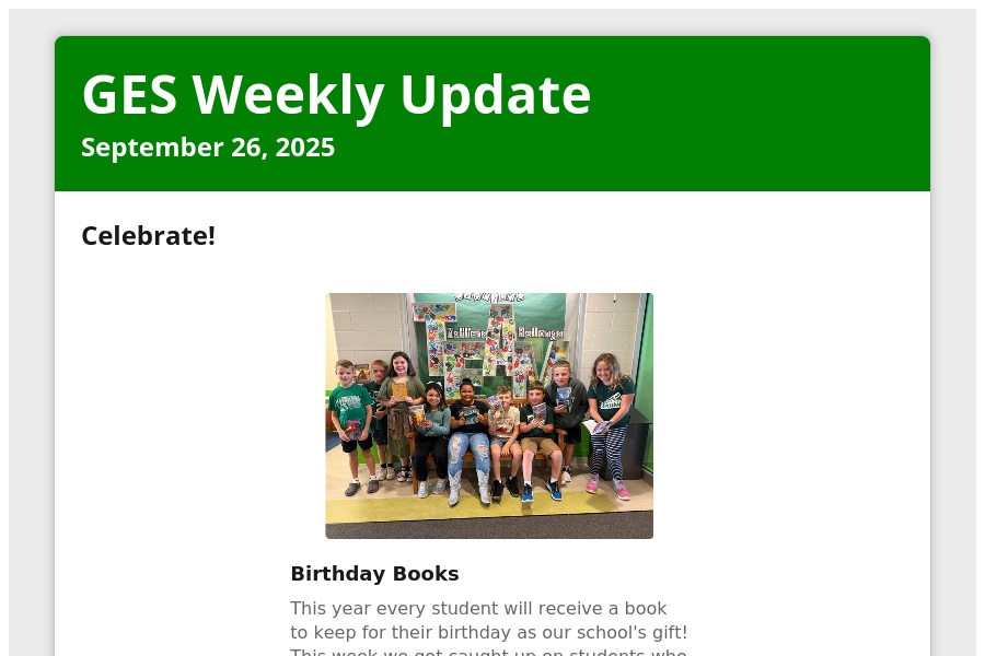 GES Weekly Update September 26, 2025 Celebrate! Birthday Books This year every student will receive a book to keep for their birthday as our sch. . .