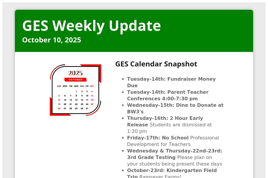 GES Weekly Update October 10, 2025 GES Calendar Snapshot Tuesday-14th: Fundraiser Money Due Tuesday-14th: Parent Teacher Conferences 4:00-7:30 p. . .