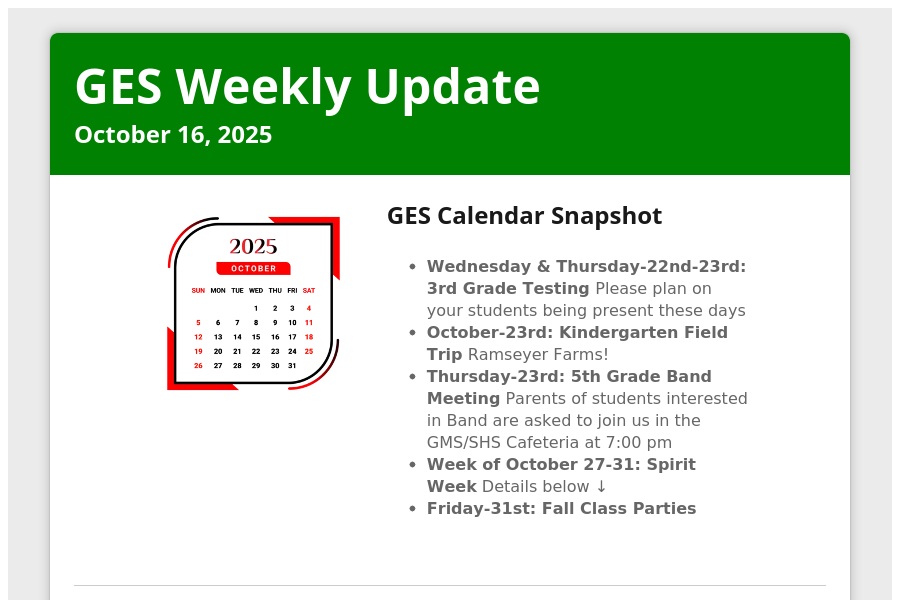 GES Weekly Update October 16, 2025 GES Calendar Snapshot Wednesday & Thursday-22nd-23rd: 3rd Grade Testing Please plan on your students being . . .