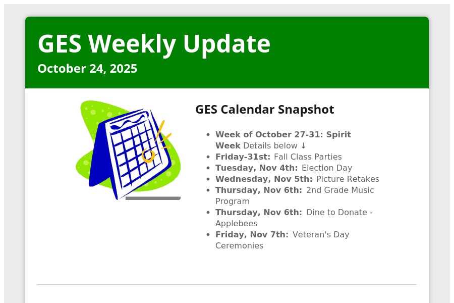 GES Weekly Update October 24, 2025 GES Calendar Snapshot Week of October 27-31: Spirit Week Details below Friday-31st: Fall Class Parties Tu. . .